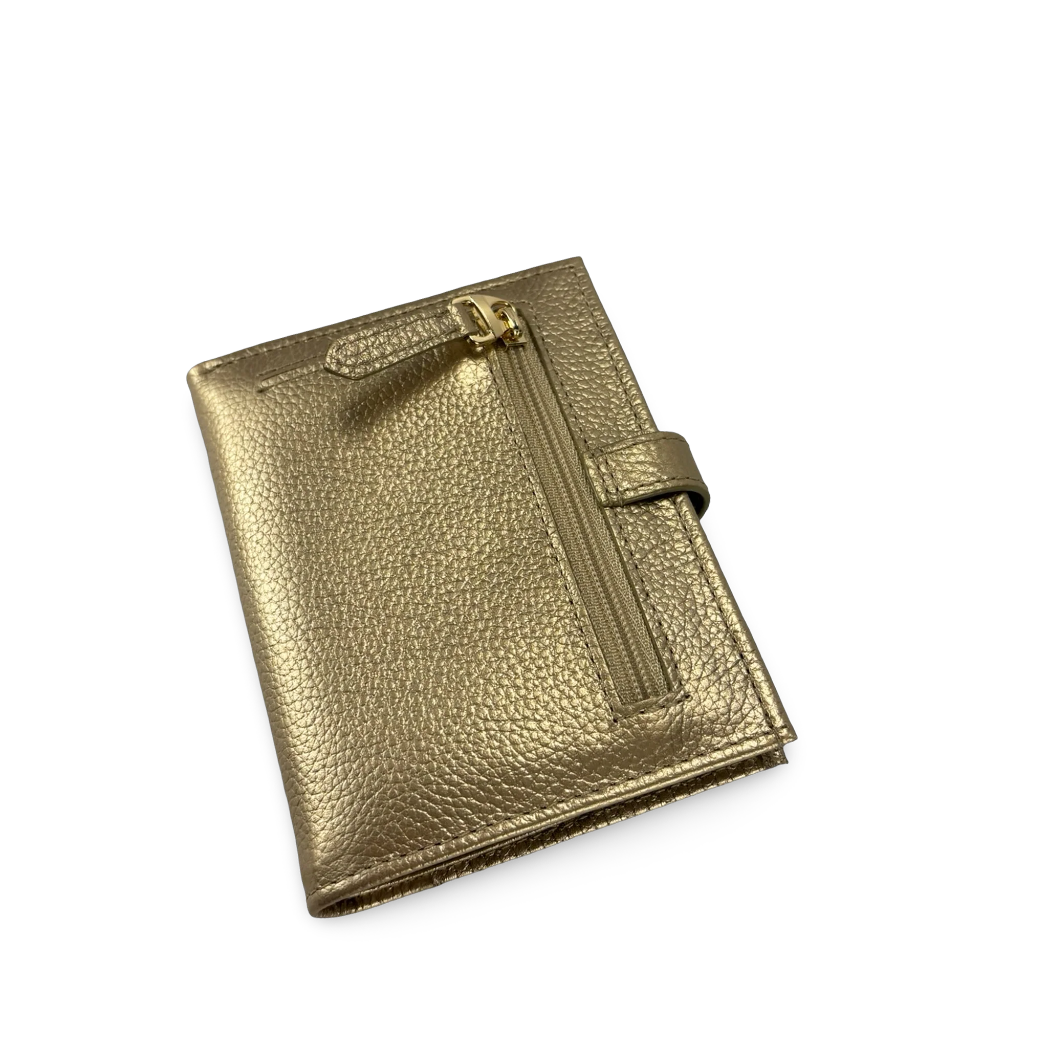 La parte externa presenta un acabado uniforme con broche de presión metálico dorado grabado con el logotipo de la marca, y en la parte trasera incluye un bolsillo con cremallera ideal para guardar monedas u objetos pequeños de manera segura.