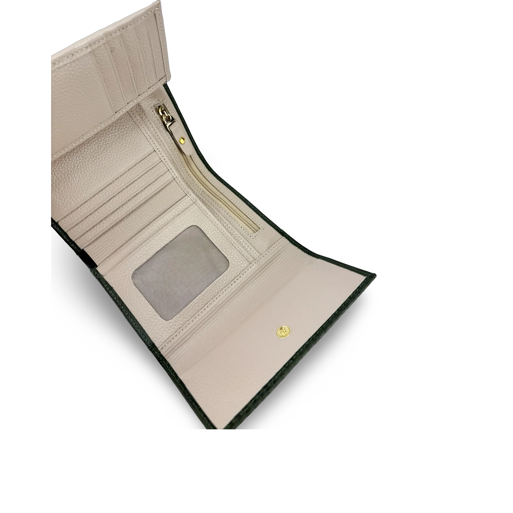 Billetera para mujer elaborada en 100% cuero vacuno liso y grabado, diseñada para ofrecer organización, seguridad y estilo. Cuenta con 16 compartimentos para tarjetas, doble fuelle para billetes, monedero interno y externo con cremallera, además de ventanas transparentes para fotos o documentos. Su cierre con botón a presión y el sistema RFID Blocker garantizan protección y practicidad en todo momento.