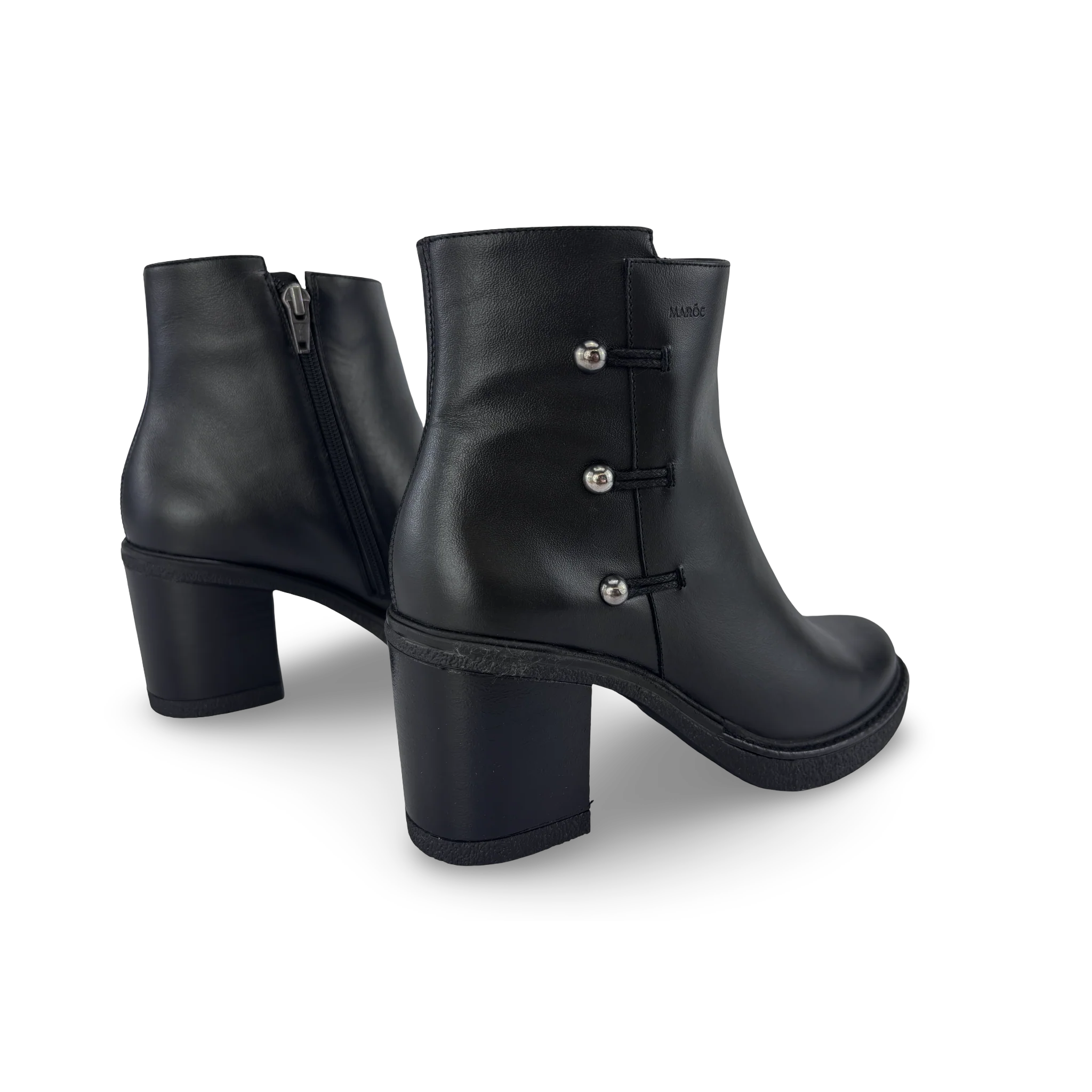 Botín para mujer de estilo contemporáneo y sofisticado, con botones decorativos y elásticos laterales que realzan su diseño y facilitan el calce. Fabricado en cuero 100% vacuno liso con acabado envejecido, destaca por su carácter y textura única. Su tacón de 6.5 cm ofrece una altura elegante y cómoda, mientras que las costuras reforzadas en la suela garantizan mayor durabilidad. Ideal para acompañar looks ejecutivos o casuales con un toque moderno y refinado.