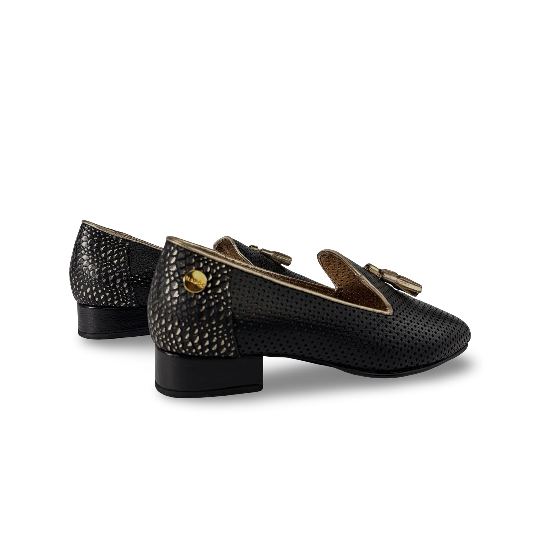 - Tipo: Mocasín con tacón plano para mujer con aplique dorado metálico logo marca Maroc en el lateral del calzado y borla decorativa en el empeine.