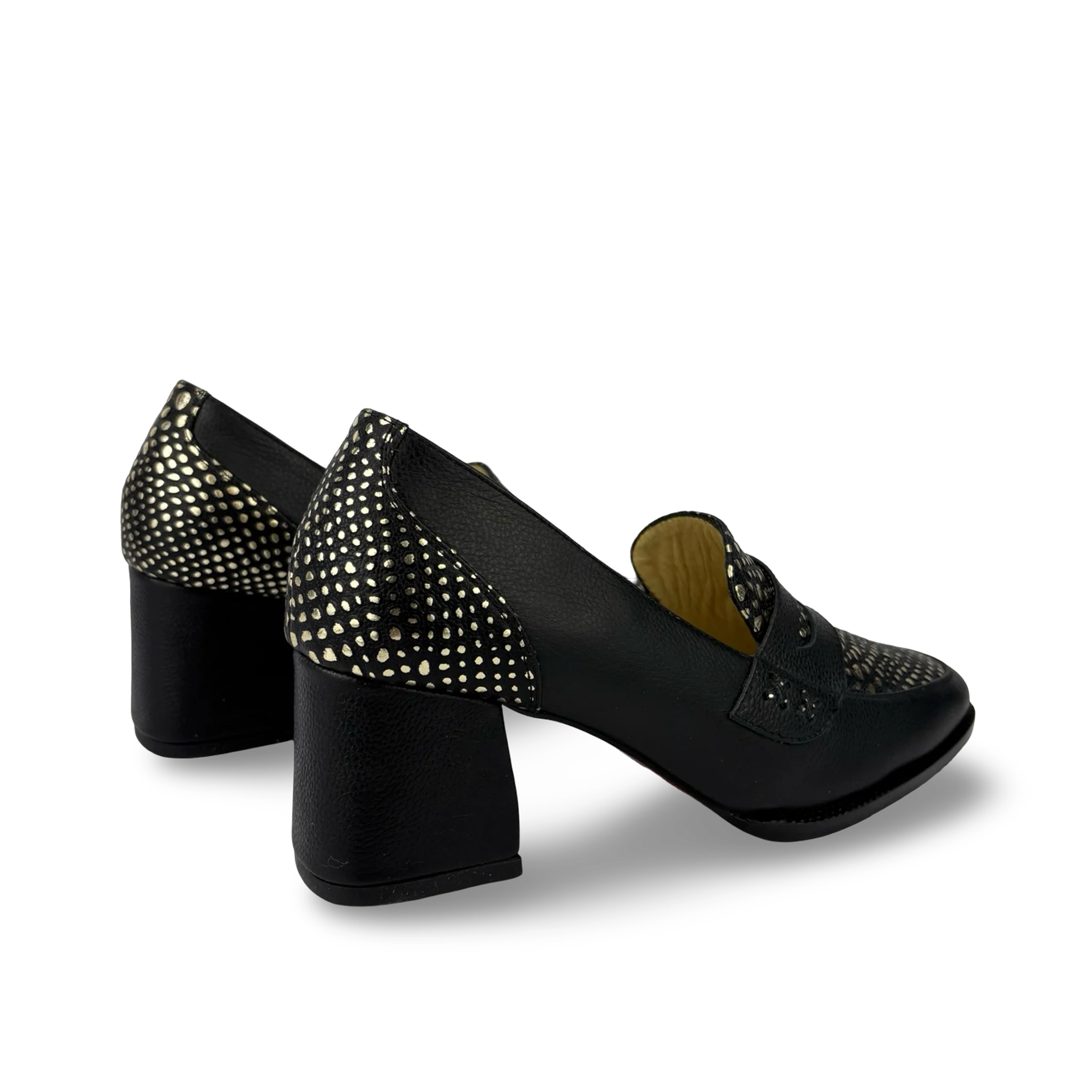 Tacón estilo mocasín para mujer elaborado en cuero vacuno liso y grabado, con antifaz decorativo en el empeine que realza su diseño clásico y sofisticado.