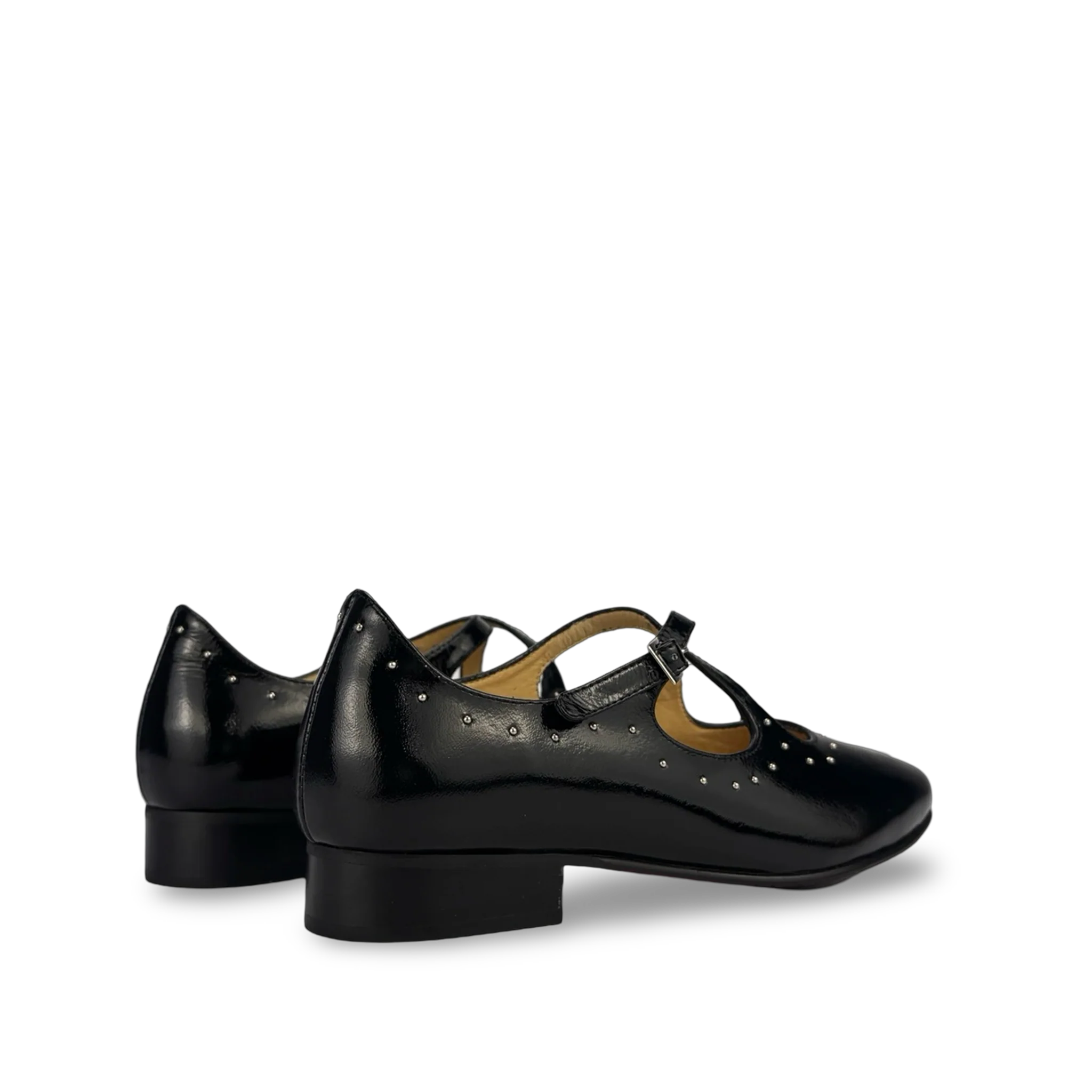 Diseño atemporal con toques modernos. Zapato tipo baleta para mujer, perfecto para un look casual o formal. Confeccionado en cuero con acabado cristal que aporta brillo sutil, puntera semiredonda y elegante trabilla cruzada con hebilla metálica cuadrada.